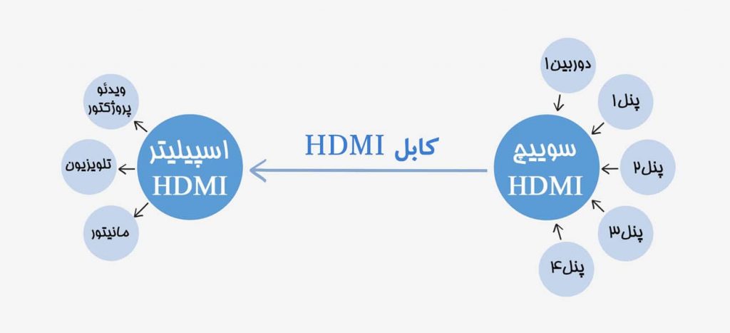 در ادامه با توجه به این که معمولا سویچرهای تصویر تنها یک خروجی ایجاد می کنند، برای به اشترک گذاری تصویر بین نمایشگرهای متعدد، از یک اسپلیتر تصویر استفاده می شود و بدین وسیله تصویر بین نمایشگرهای مقصد به اشتراک گذاشته می شود.