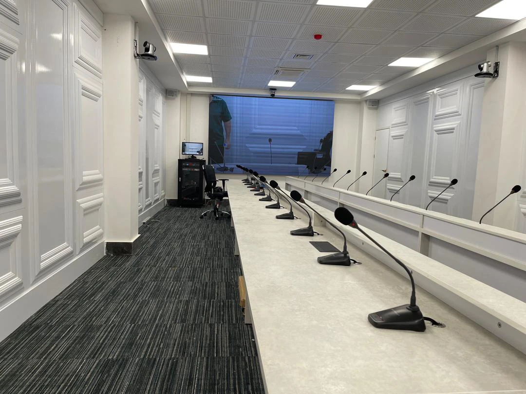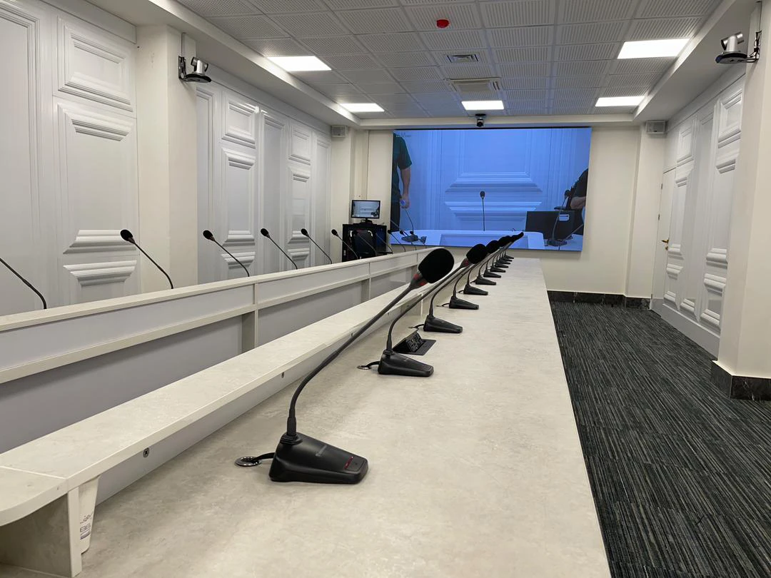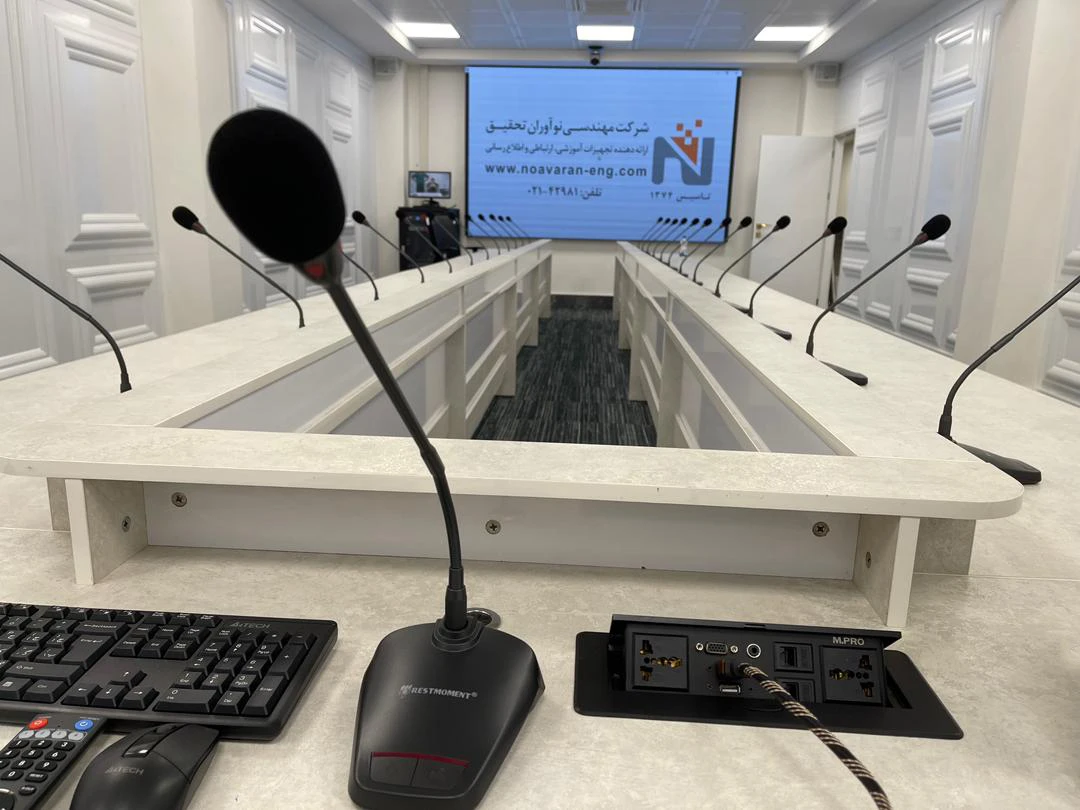 تجهیز سالن کنفرانس با پیادهسازی سیستم کنفرانس دیجیتال یکپارچه، ویدئو وال بزرگ و سیستم تصویربرداری هوشمند 4K جهت برگزاری جلسات با صدای شفاف، تصویر باکیفیت و قابلیت ارائه محتوای متمرکز.