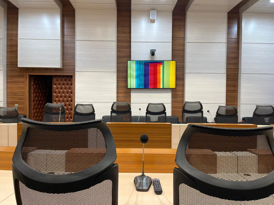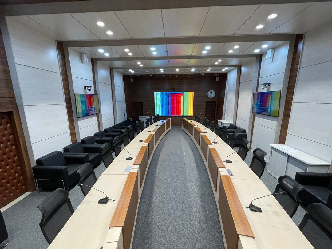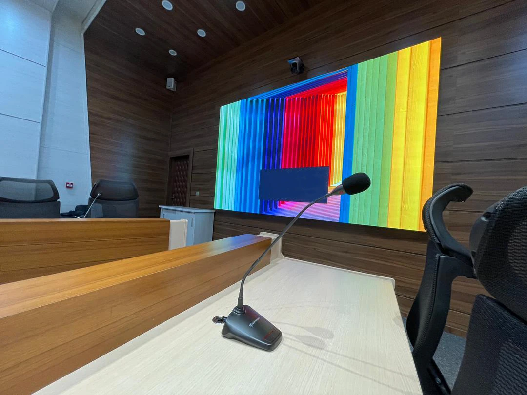 6 بلندگوی دکوراتیو به صورت نامحسوس و هماهنگ با معماری در سالن جانمایی شدند و یک ویدئو وال بزرگ با ابعاد 320×192 سانتیمتر به عنوان نمایشگر اصلی نصب گردید. همچنین 3 دوربین کنفرانس رباتیک 4K و 3 پنل رومیزی، عملکرد فنی بالا را در کنار حفظ کامل زیبایی سالن تضمین کردند.